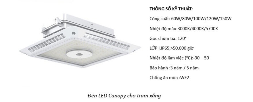 Đèn LED Canopy: Những loại đèn này thường được sử dụng trong các trạm xăng để cung cấp ánh sáng trực tiếp trên các bộ phân phối nhiên liệu và các khu vực mái che. Chúng được thiết kế để hoạt động với mức quang thông cao.