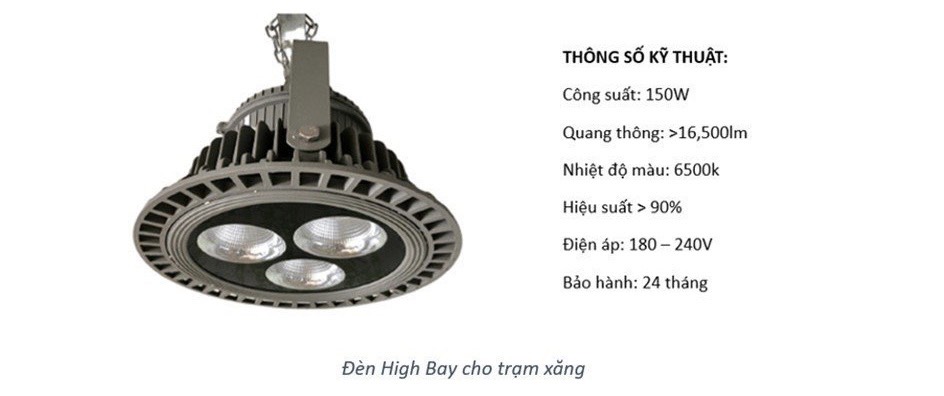 Đèn LED High Bay: Loại đèn này thường được sử dụng trong các mái vòm trạm xăng có trần cao. Chúng cung cấp ánh sáng đồng đều, sáng sủa, lý tưởng cho các khu vực rộng mở.