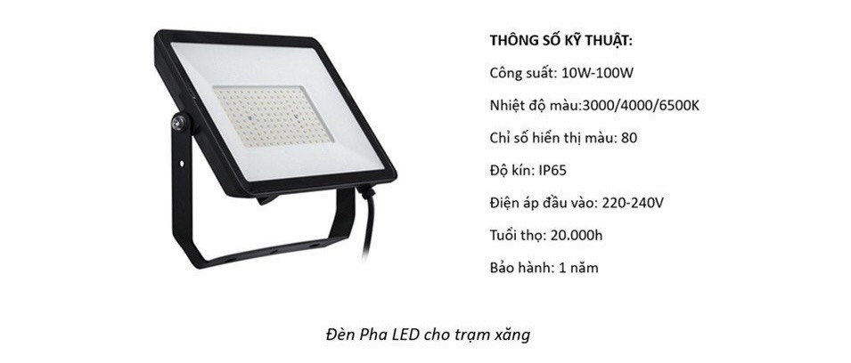 Đèn pha LED: Đèn pha LED thường được lắp đặt ở những khu vực trống của trạm xăng hoặc bãi đậu xe để cung cấp ánh sáng rộng. Chúng có công suất và góc chùm tia khác nhau, đồng thời mang lại hiệu suất quang thông cao.
