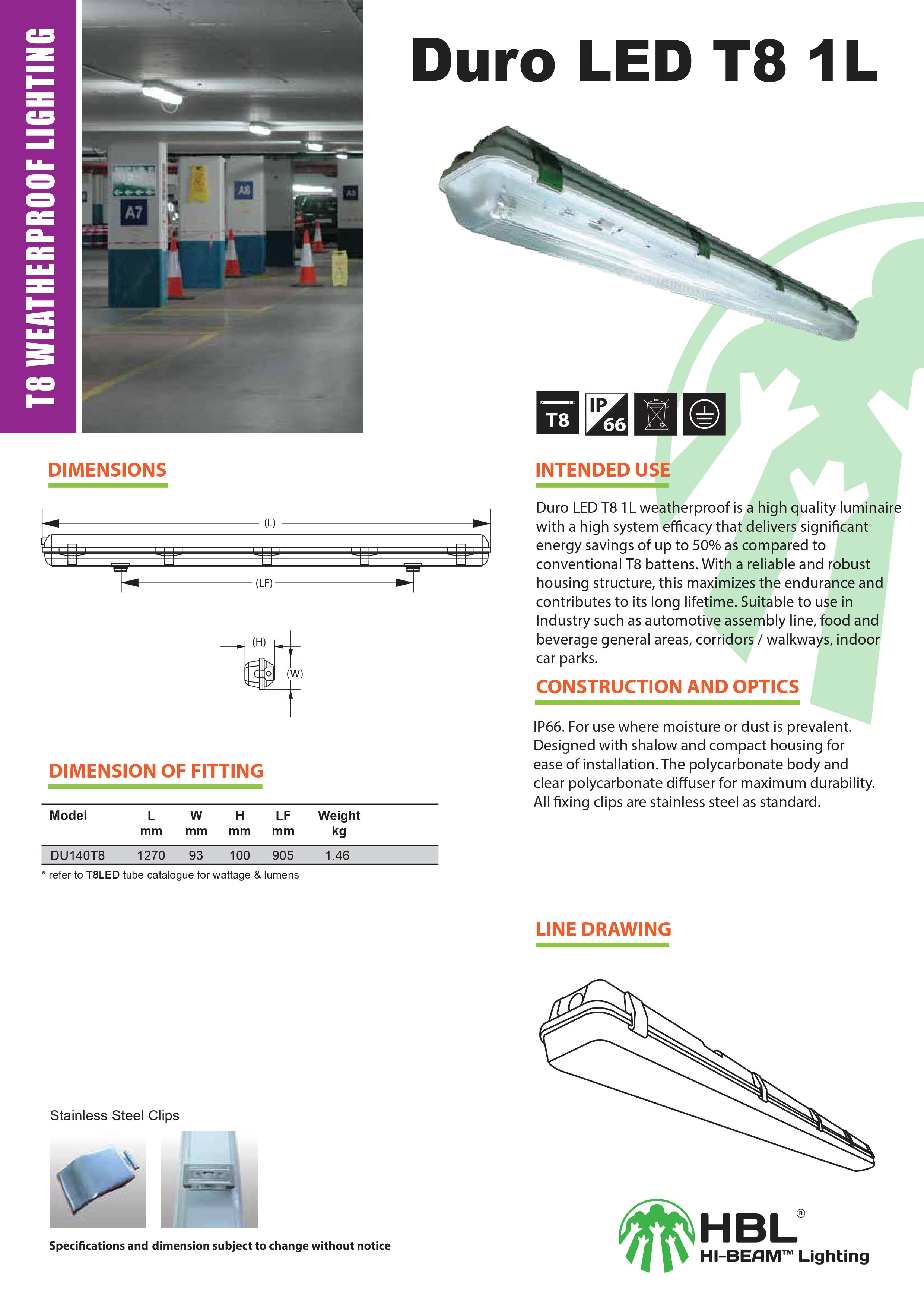 Bộ đèn LED chống nước Duro LED T8 1L sử dụng 1 bóng LED tube bên trong. Bộ đèn chất lượng cao giúp tiết kiệm 50% điện năng tiêu thụ so với đèn T8 truyền thống. Cấu trúc vỏ đèn chắc chắn, bền với thời gian. Thích hợp sử dụng trong công nghiệp như dây chuyền lắp ráp ô tô, chế biến thực phẩm, đồ uống, hành lang, lối đi, bãi đậu xe trong nhà.