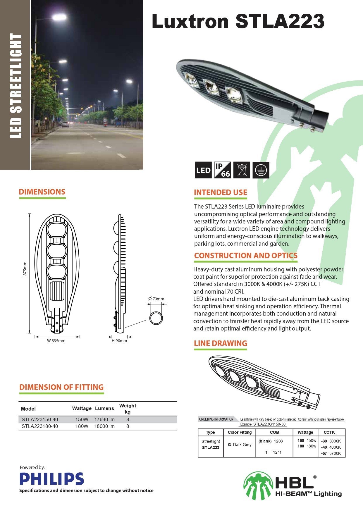 Đèn đường LED STLA223 với hiệu suất quang và tính linh hoạt vượt trội cho nhiều ứng dụng chiếu sáng các khu vực. Công nghệ Luxtron LED mang đến khả năng chiếu sáng đồng đều, tiết kiệm năng lượng cho lối đi, bãi đỗ xe, khu thương mại, sân vườn.