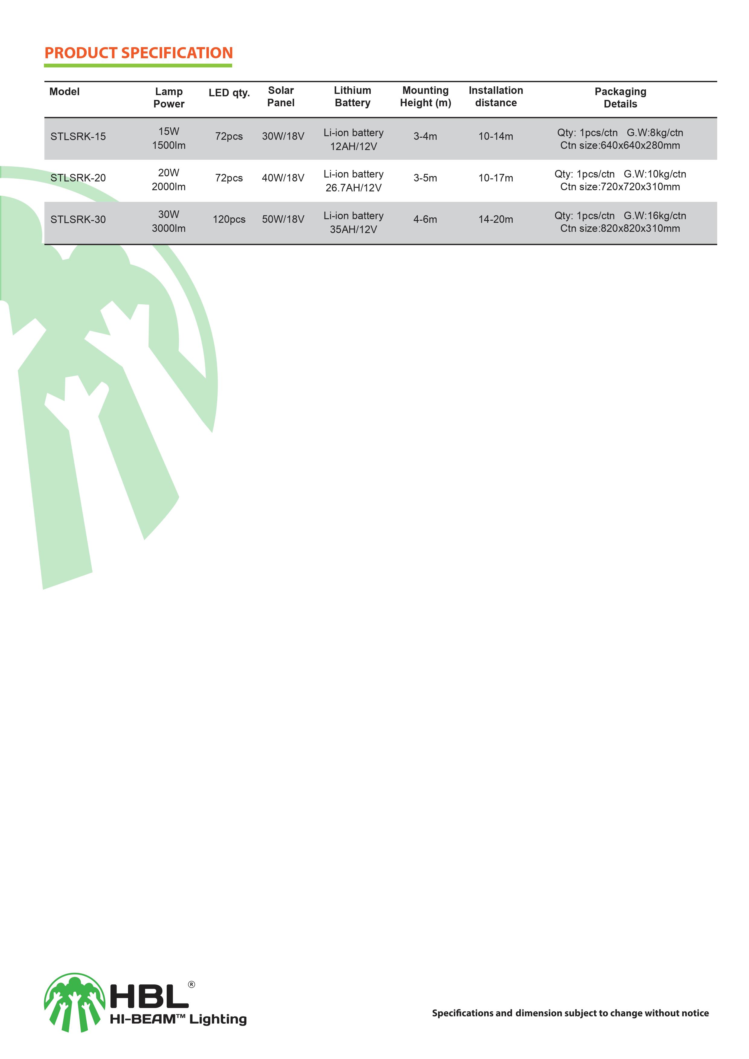 Pin Lithium với khả năng chống chịu, bền với thời tiết hơn bất kỳ loại pin nào khác. Vỏ đèn bằng hợp kim nhôm, quá trình oxy hóa anot nhôm mang lại khả năng chống ăn mòn cao. Chân đế và giá đỡ dày dặn giúp cản gió tốt hơn. Công suất: 15W, 20W, 30W.