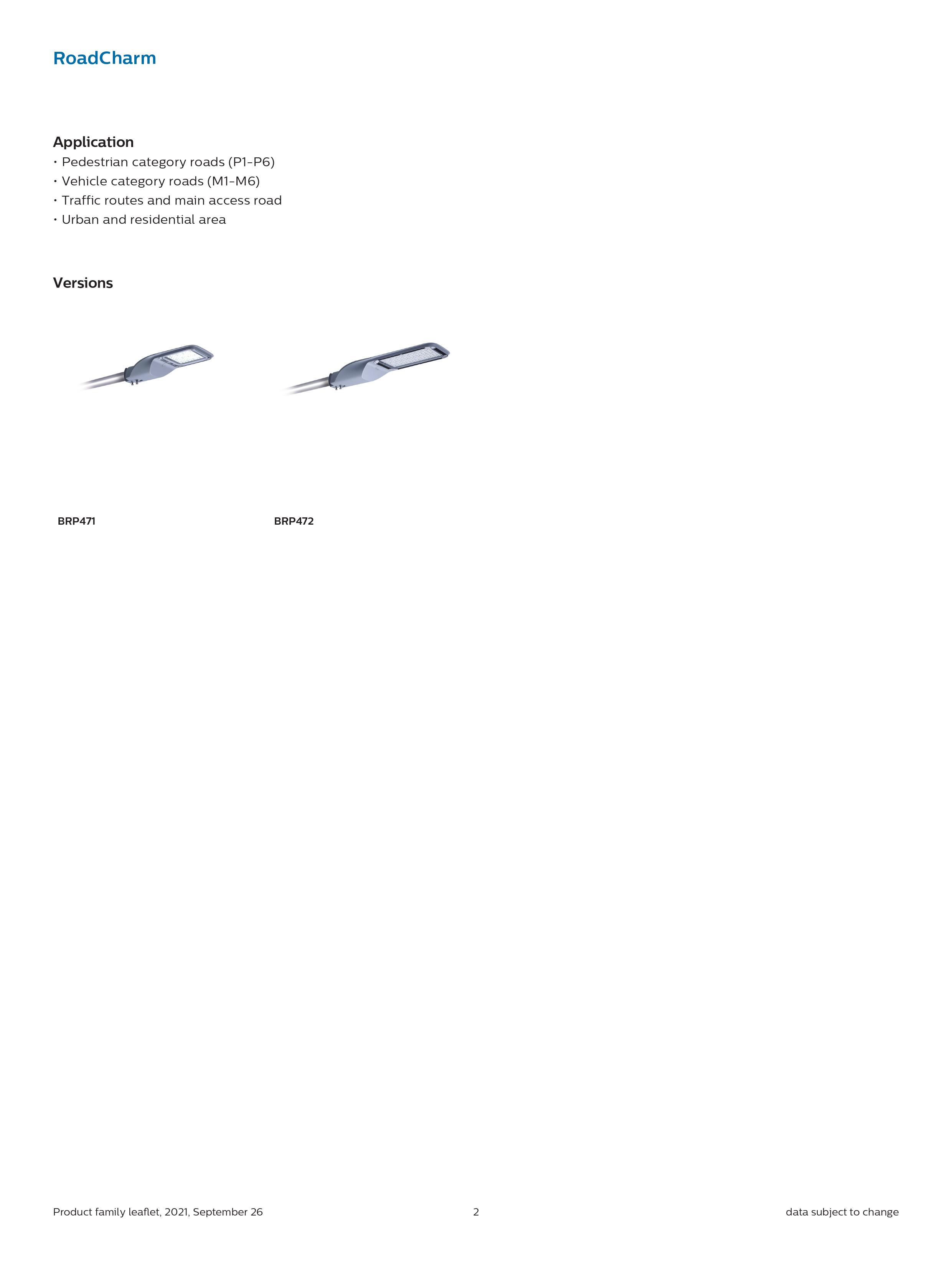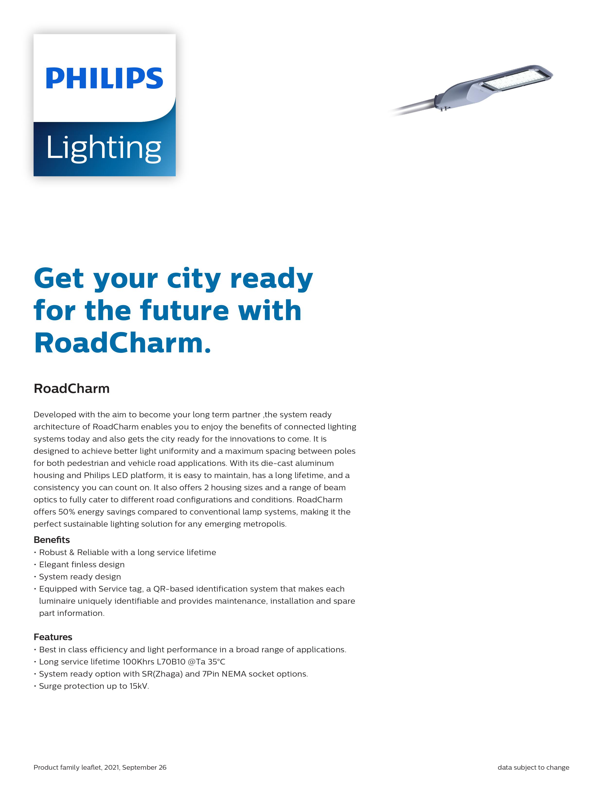 Được phát triển với mục đích trở thành đối tác lâu dài của bạn, kiến trúc sẵn sàng cho hệ thống của RoadCharm cho phép bạn tận hưởng lợi ích của hệ thống chiếu sáng kết nối ở thời điểm hiện tại, đồng thời giúp thành phố sẵn sàng cho những cải tiến trong tương lai. Thiết kế đạt độ đồng nhất ánh sáng tốt hơn và khoảng cách tối đa giữa các cột đèn cho cả các ứng dụng đường đi bộ và đường phương tiện lưu thông. Với vỏ nhôm đúc và nền tảng Philips LED, thiết bị này dễ dàng bảo trì, có tuổi thọ cao và độ nhất quán đáng tin cậy. Sản phẩm còn có sẵn 2 kích thước vỏ đèn và nhiều tùy chọn chóa quang học, đáp ứng đầy đủ các cấu hình và điều kiện đường phố khác nhau. RoadCharm tiết kiệm 50% năng lượng so với các hệ thống đèn truyền thống, trở thành giải pháp chiếu sáng bền vững hoàn hảo cho bất kỳ đô thị đang phát triển nào.