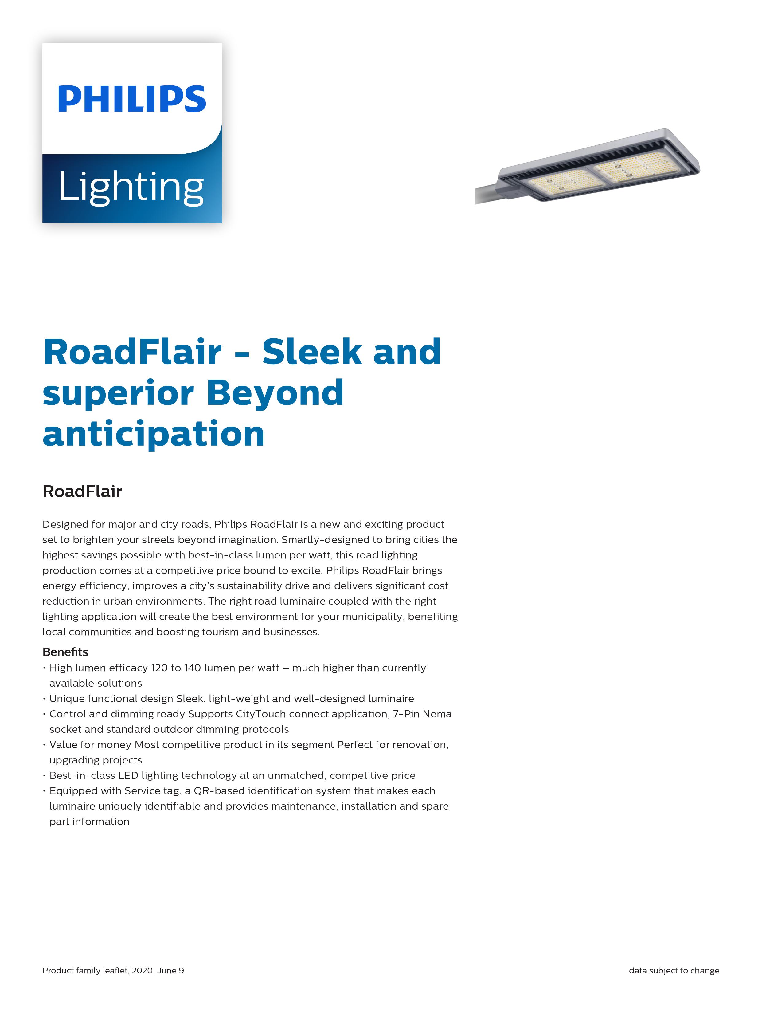 Được thiết kế cho các tuyến đường lớn và đường trong thành phố, Philips RoadFlair là một sản phẩm mới thú vị sẽ khiến đường phố trở nên rực rỡ ngoài sức tưởng tượng. Thiết kế thông minh giúp tiết kiệm tối đa nhờ chỉ số quang thông trên mỗi watt cao hàng đầu, đây là loại đèn đường có giá cạnh tranh nhất thị trường. Philips RoadFlair mang lại hiệu quả năng lượng, thúc đẩy phát triển thành phố bền vững và giảm đáng kể chi phí môi trường đô thị. Bộ đèn đường sử dụng cho đúng mục đích chiếu sáng phù hợp sẽ tạo nên môi trường đô thị tốt nhất, mang lại lợi ích cho các cộng đồng địa phương, thúc đẩy du lịch và hoạt động kinh doanh.