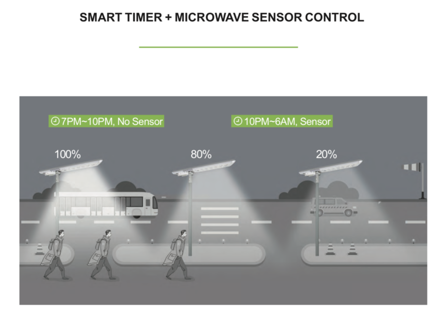 Hệ thống điều khiển thông minh của bộ đèn với chức năng tính toán thông minh kịp thời dung lượng pin còn lại trong điều kiện thời tiết xấu, điều chỉnh chế độ làm việc của bộ đèn giúp đảm bảo thời gian chiếu sáng kéo dài.