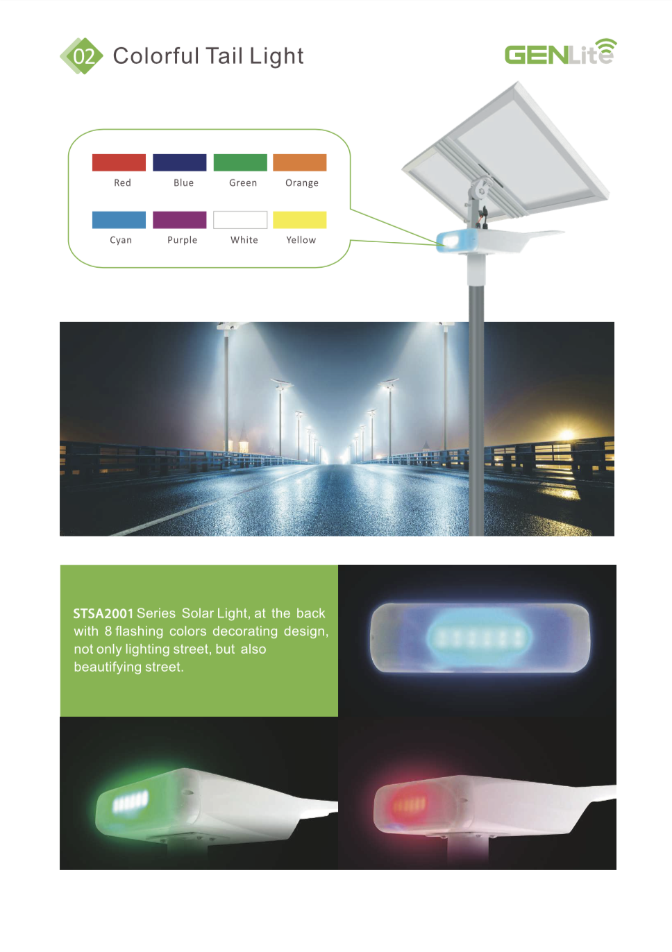 Đèn Đường LED Năng Lượng Mặt Trời All-in-Two Tích Hợp STSA2001 mang đến khả năng chiếu sáng hiệu quả cho nhiều ứng dụng. Thiết kế đuôi đèn có đèn flash 8 màu: đỏ, xanh dương, xanh lá, cam, xanh lơ, tím, trắng, vàng; không chỉ có chức năng chiếu sáng mà còn góp phần cho chức năng trang trí.