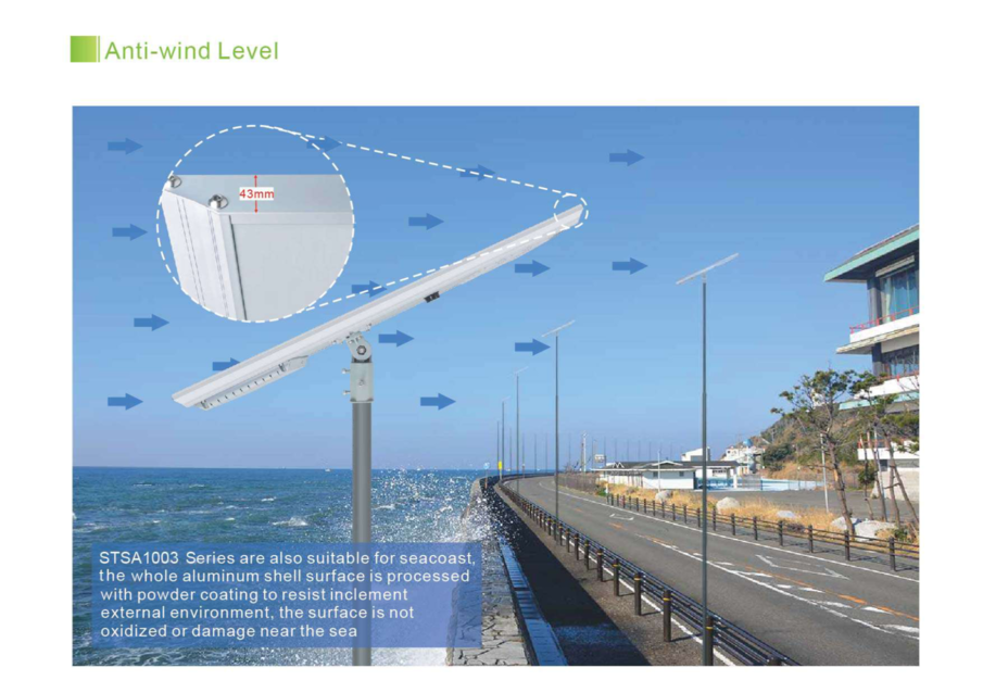 Đèn Đường LED Năng Lượng Mặt Trời All-in-One Tích Hợp STSA1003 mang đến khả năng chiếu sáng hiệu quả cho nhiều ứng dụng. Thích hợp cho lắp đặt ở bờ biển, thân đèn bằg hợp kim nhôm, bề mặt sơn tĩnh điện, chống chịu môi trường khắc nghiệt, tránh bị oxy hóa hoặc hư hỏng cho gần biển.