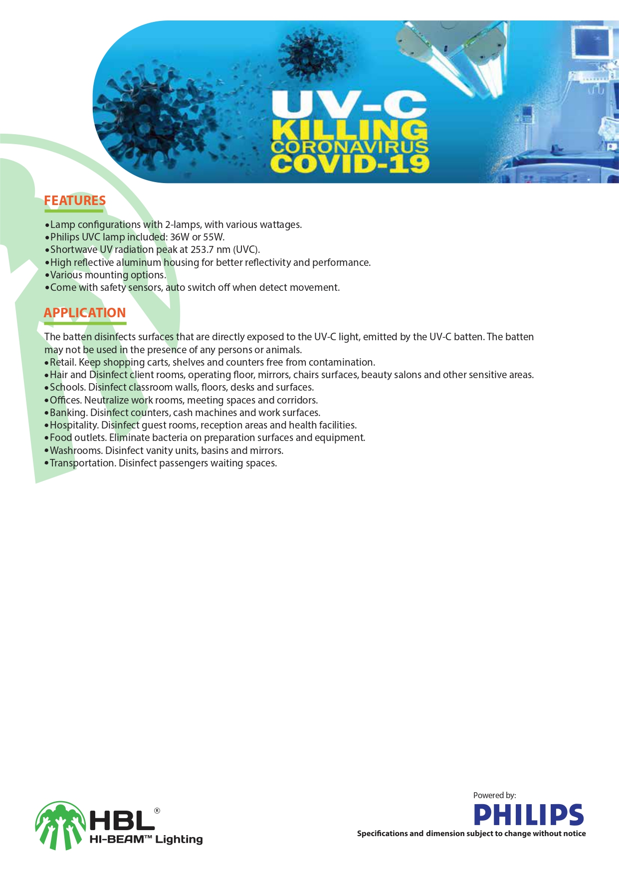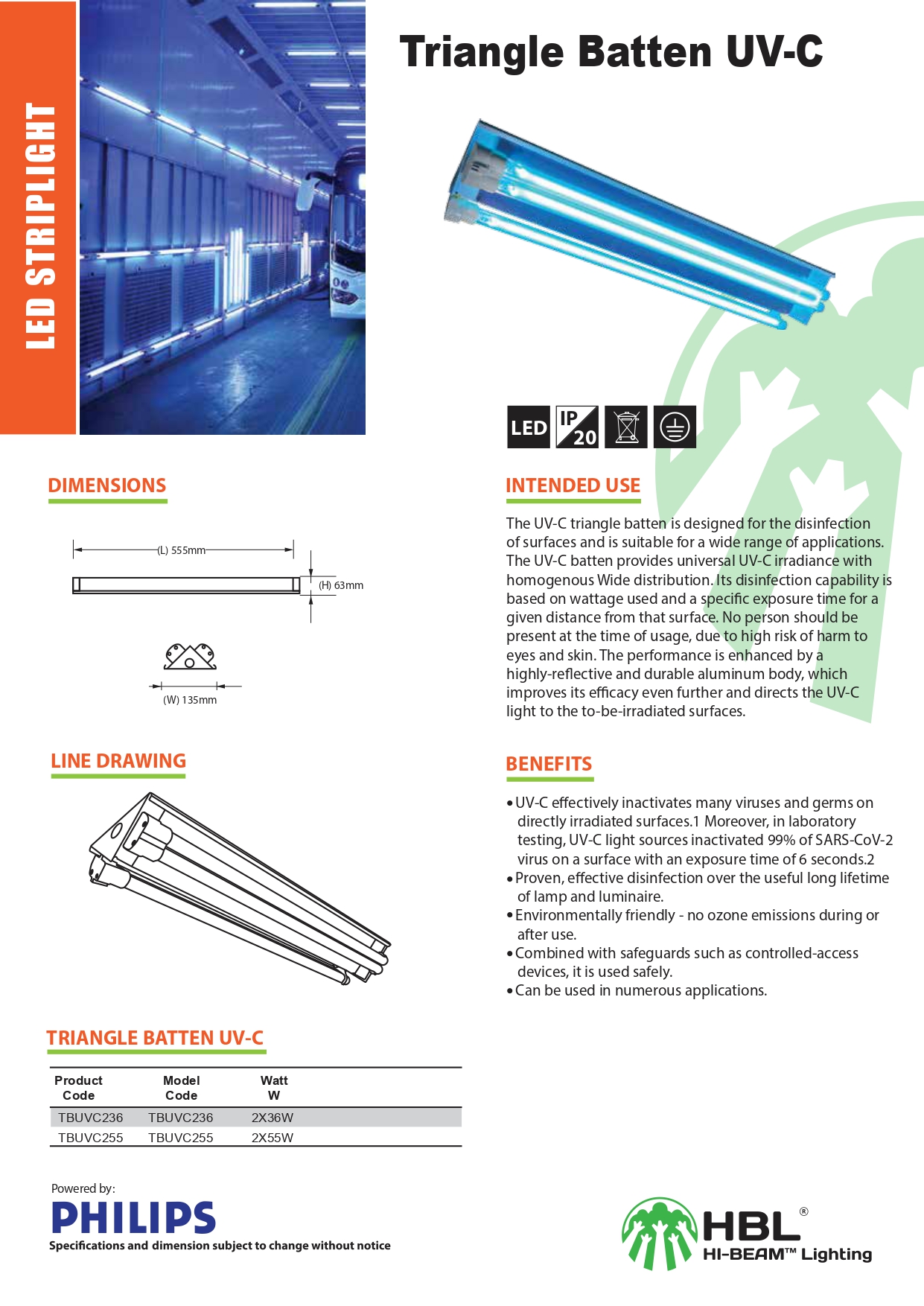 Bộ đèn LED máng tam giác UV-C được thiết kế cho mục đích khử trùng bề mặt và thích hợp cho nhiều ứng dụng. Bộ đèn phát ra bức xạ UV-C phổ quát, phân bố rộng và đồng nhất. Khả năng khử trùng tùy thuộc vào công suất đèn, thời gian chiếu đèn (bề mặt tiếp xúc với ánh sáng UV-C) cụ thể đến bề mặt vật thể trong một khoảng cách nhất định.