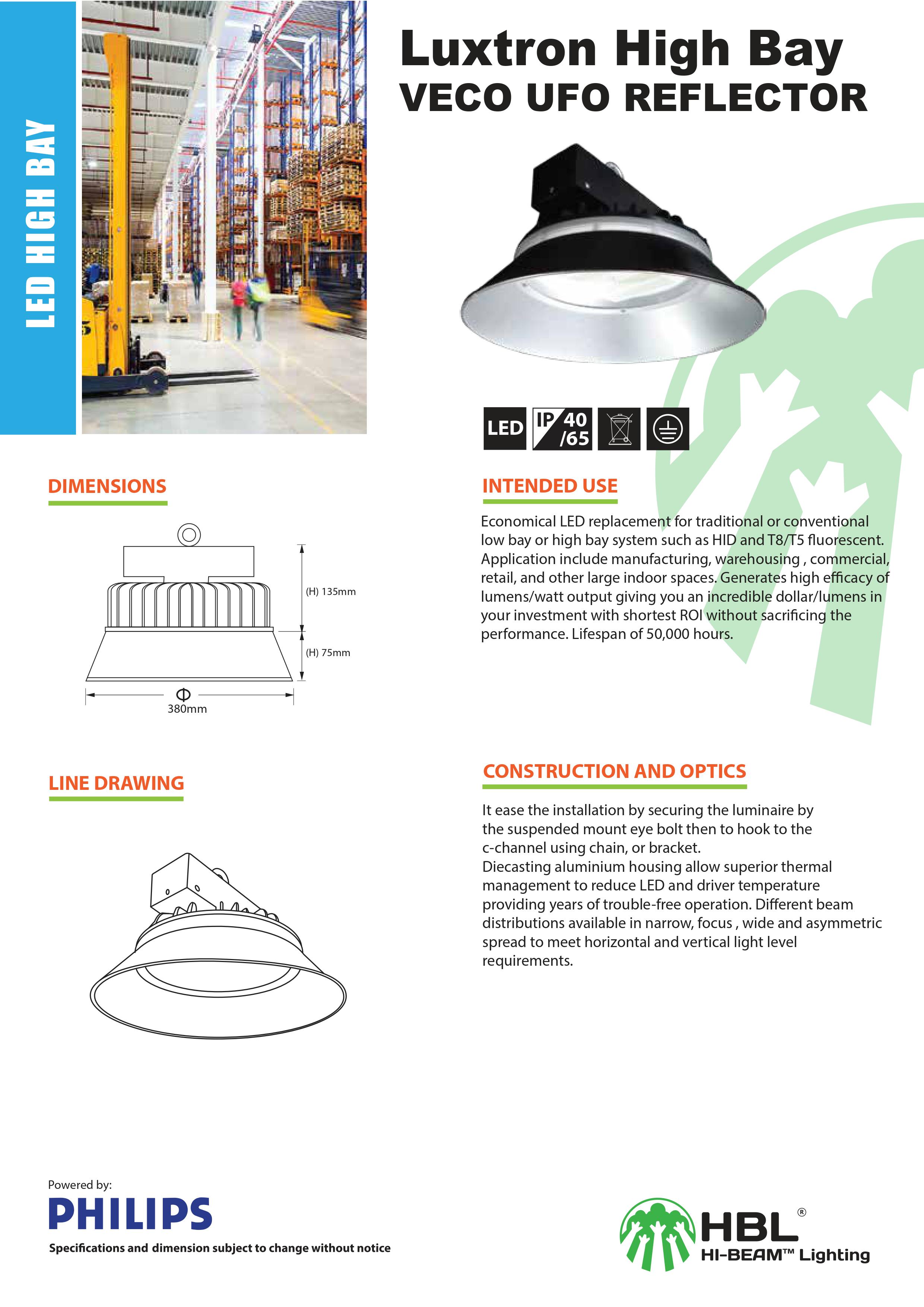 Dòng Highbay LED Luxtron UFO là phương án chiếu sáng tiết kiệm, thay thế cho hệ thống đèn lowbay hoặc highbay HID và đèn huỳnh quang T8/T5 truyền thống. Ứng dụng cho nhà xưởng, nhà kho, khu thương mại, bán lẻ và các khu vực rộng lớn trong nhà. Bộ đèn với hiệu suất quang Lm/W cao, mang lại hiệu quả đầu tư lớn $/Lm với thời gian hoàn vốn ngắn nhất mà không phải hy sinh công năng. Tuổi thọ 50.000h.